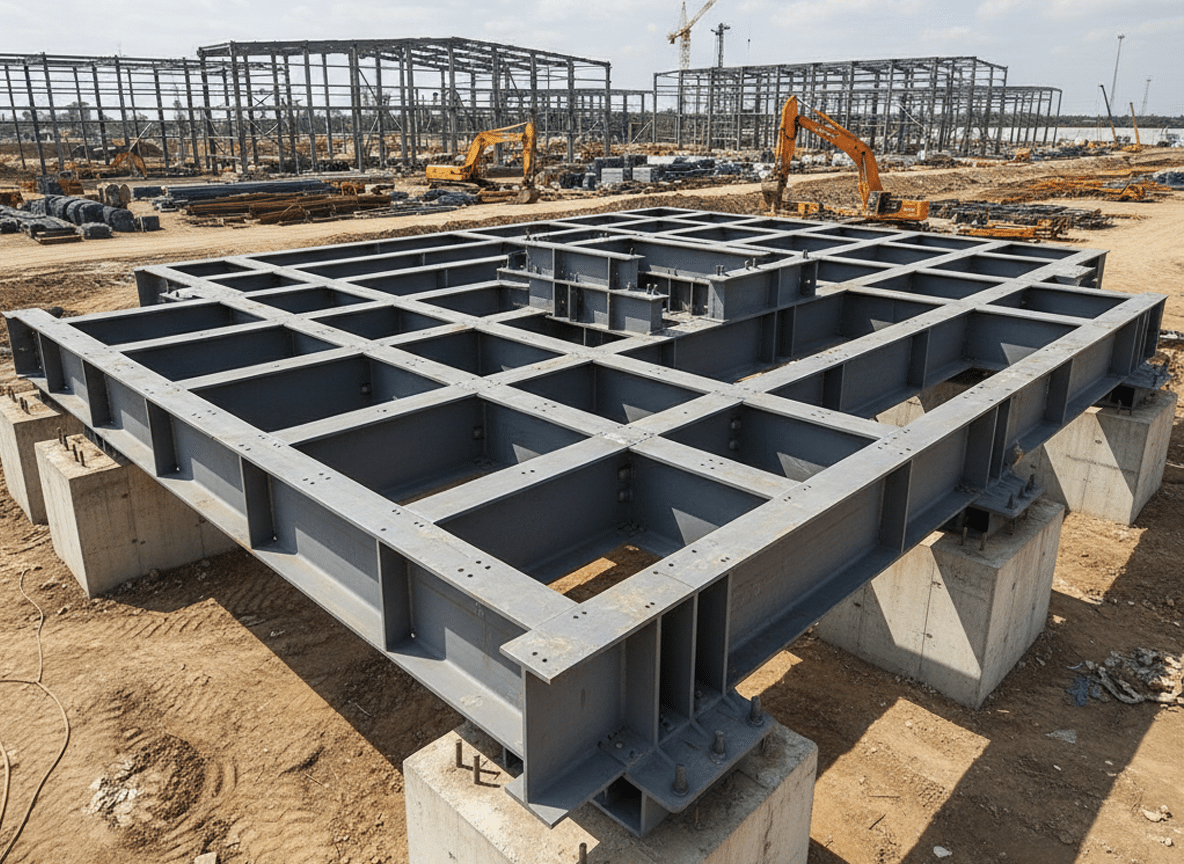 Металлический ростверк изготавливается из прочных стальных профилей — двутавров, швеллеров, профильных труб или коробчатых сечений. Эти элементы соединяются сваркой или болтовыми соединениями, образуя единую несущую систему, способную воспринимать и перераспределять нагрузки.